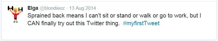 “Sprained back means I can’t sit or stand or walk or go to work, but I CAN finally try out this Twitter thing. #myfirstTweet”