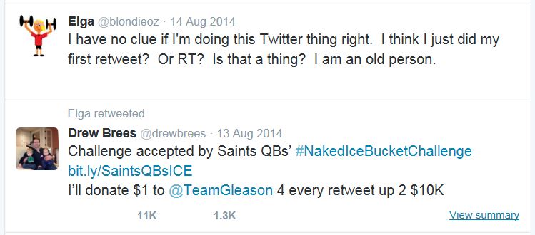 I spent my first day on Twitter trying to figure out how things work and trying to rack up people to follow, which was fun and all, but also lead me down a rabbit-hole of celebrity-adding that really made no sense after a while. Eventually I somehow wound up reading a tweet by Drew Brees regarding the ice bucket challenge. I don’t even like football and barely know who Drew Brees is, and I thought the ice bucket challenge fad was stupid. But I also liked the idea that maybe this Twitter thing could do some good in the world, and maybe I could do my little bit to contribute, so I obeyed Football God Drew Brees and retweeted his call for retweets. I’m not sure if I thought my one retweet would make a difference, since obviously Drew Brees could cough up $10K without my assistance, but maybe it felt nice to be a part of something? Who knows. Almost immediately I freaked out like the Twitter-idiot that I am and started wondering if I was doing stuff correctly. Help, internet! I Tweeted about my confusion, my friend replied by saying I was doing fine, which just confused me more, and I put the Twitter away for a couple days.