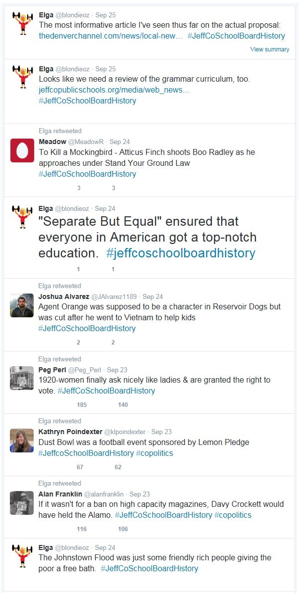 A month or so passed, and one day I realized my true Twitter calling: Hastag Activism. This was the one bit of twitter culture that didn’t seem like a complete waste to me. This is what really drew me to check it out in the first place. Every now and then, some news article refers to a hashtag being used to spread change. The most famous, perhaps, was #bringbackourgirls, the plea to save kidnapped schoolgirls in Nigeria, which is horribly depressing, but the ones that most intrigued me were the ones that could be both productive and funny, such as #foxnewsfacts, created by Birmingham residents hilariously crying out against Fox News’ completely false allegation that the city had all-Muslim no-go zones. The one that sucked me in was #JeffCoSchoolBoardHistory, which was being used yb concerned citizens in response to a Colorado school board that was weighing the idea of whitewashing advanced American history classes to be more patriotic (and implicitly less factual). Hashtag activists flocked to Twitter to make up whitewashed American history facts, and I decided to join them with a couple Tweets of my own: