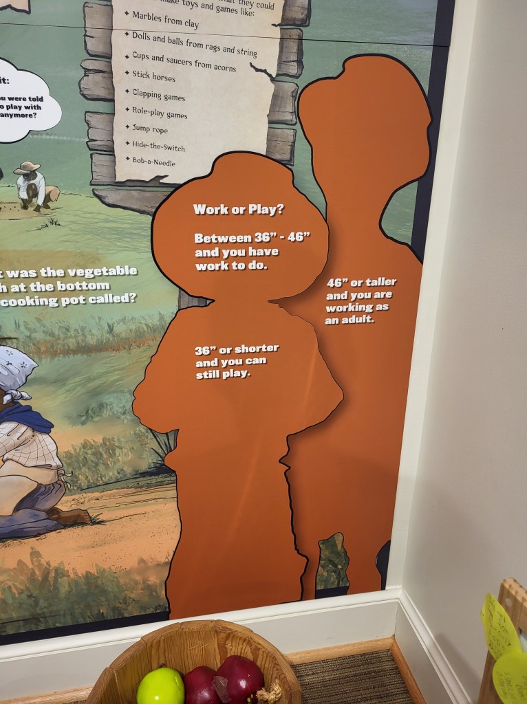 What about physical materials to view? There were only a couple displays of actual objects: a display of objects found in a landfill that probably belonged to an enslaved woman in the 18th century, the above-pictured diorama, and an actually ok interactive kids’ display about life as an enslaved child that asked them questions like “how would you feel if your family was ripped away from you?” and “can you lift this bucket of water?” and “are you too tall to play?” A shelf next to the kids’ display contained a demo Topsy Turvy doll.
