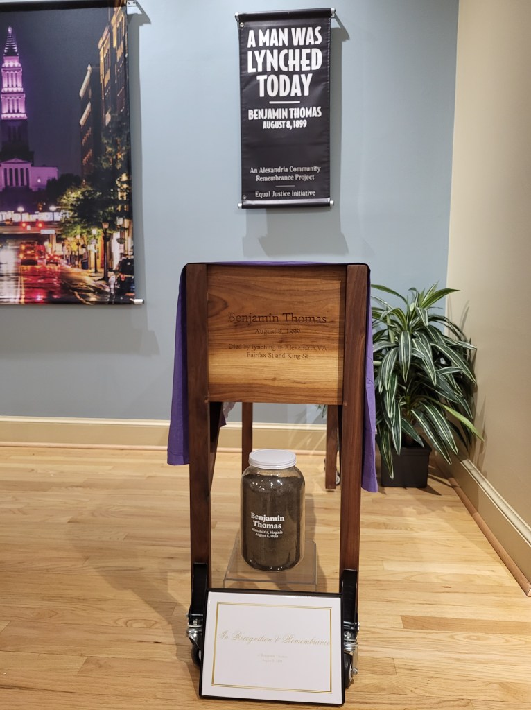 The second half of the museum was a similarly-sized room that contains temporary exhibits. Today there were two exhibits: one about the Black Lives Matters movement in Alexandria, and another one about a ceremony to commemorate Alexandria’s two lynchings. The BLM material was interesting, insofar as I was here for that (I didn’t participate for fear of covid, but I watched the protestors march past my house), so it was kinda neat seeing something I’m familiar with commemorated in a museum. I remember it well enough that I thought, “Wait, it rained that day. I remember cuz I considered offering umbrellas and/or temporary shelter to people.” This display also had much more material than the entirety of the history part of the history museum, including tons of photos, posters and other protest art, and a binder full of official comments from various city officials. There was one from our (now-retired) city sheriff, who I’ve hung out with a couple times in weird situations. Here we are delivering prizes to best-decorated houses together: