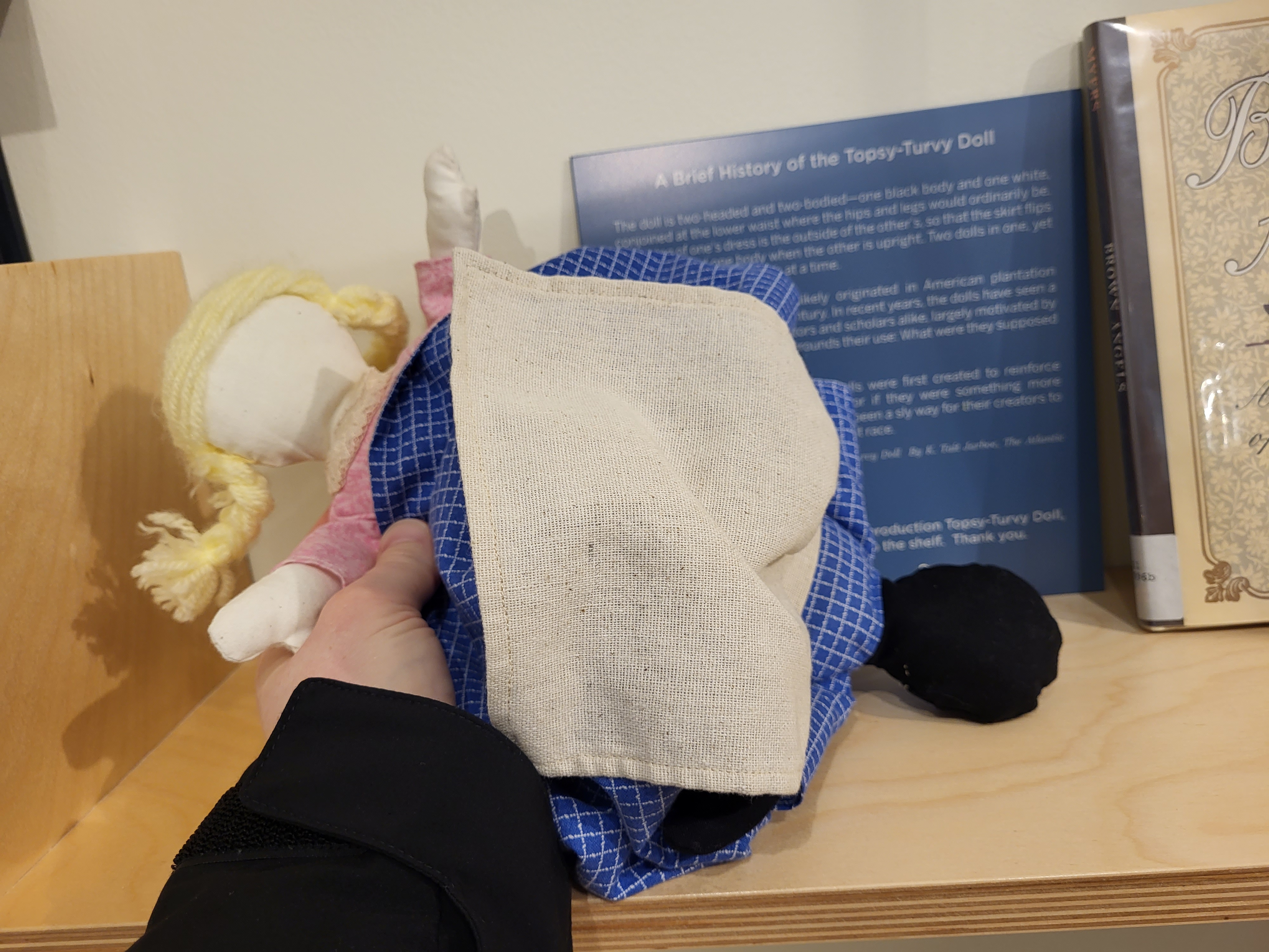 What about physical materials to view? There were only a couple displays of actual objects: a display of objects found in a landfill that probably belonged to an enslaved woman in the 18th century, the above-pictured diorama, and an actually ok interactive kids’ display about life as an enslaved child that asked them questions like “how would you feel if your family was ripped away from you?” and “can you lift this bucket of water?” and “are you too tall to play?” A shelf next to the kids’ display contained a demo Topsy Turvy doll.