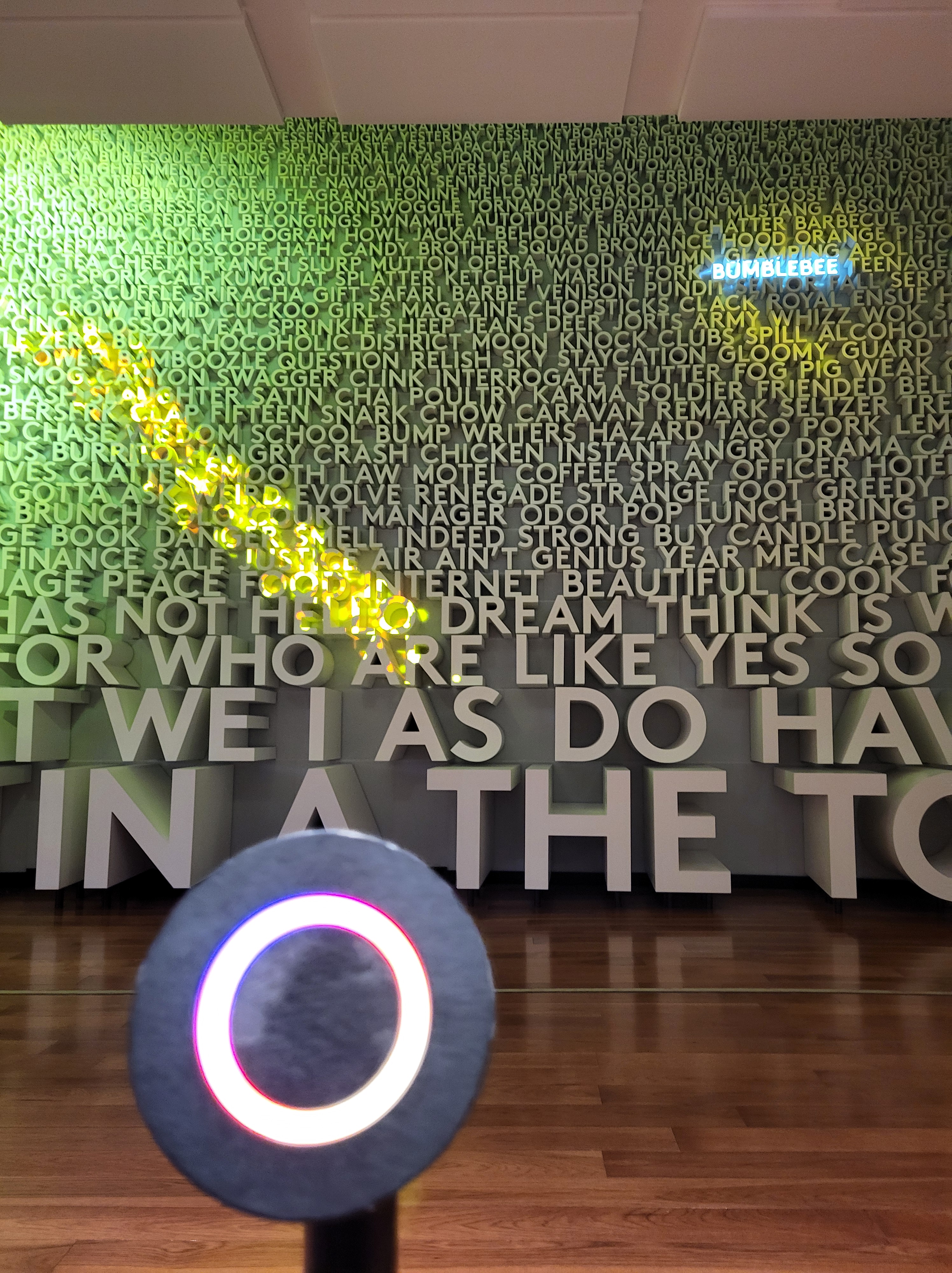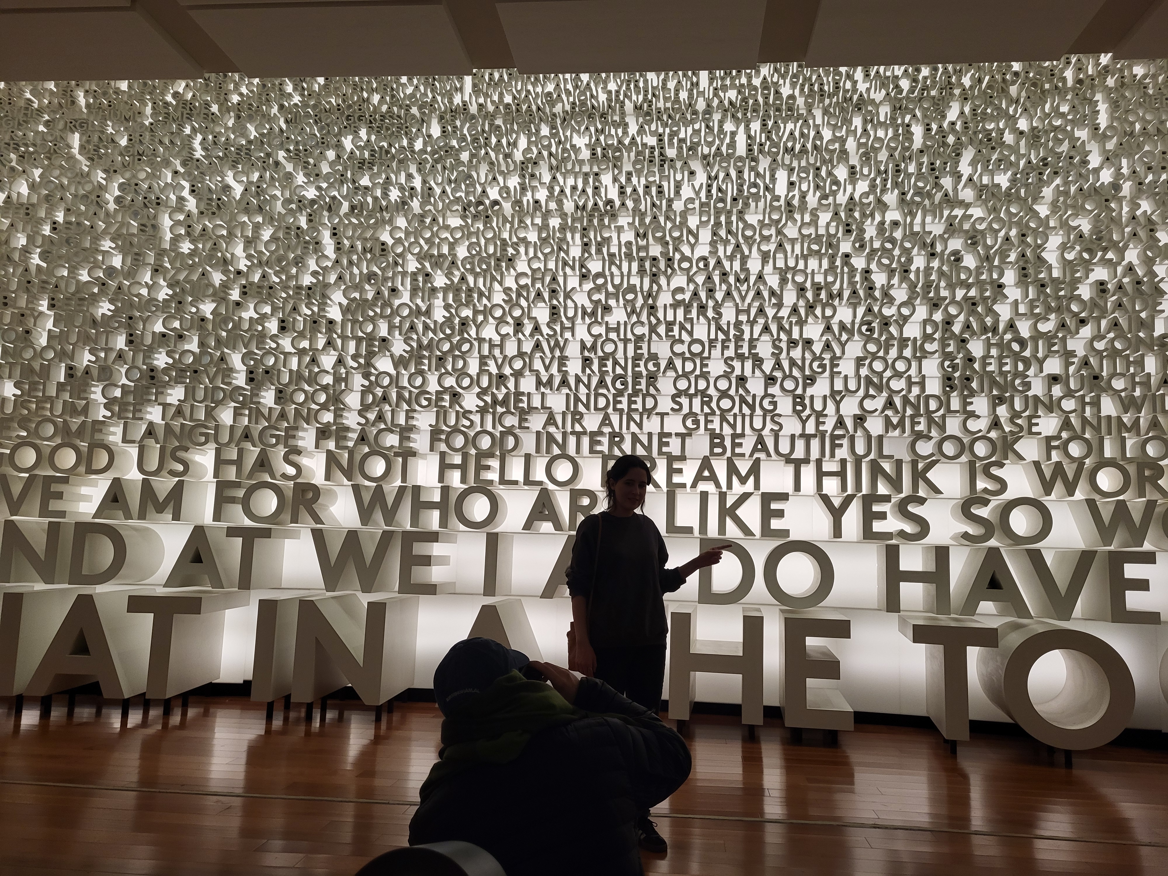 The next room, however, was amazing. It’s basically just a documentary about the history of the English language. You could get all the same content just listening to the audio on a podcast. But the presentation was super engaging. Instead of a video screen, one wall is covered in thousands of words in white blocky 3D text. The audience sits or stands along the opposite wall, where we can talk into colorful microphones to do a call-and-response when prompted by the narrator. As the video plays, whenever the narrator talks about a word, it lights up on the screen. The narrator will ask us a question about certain words, and everyone in the audience started yelling our words into the microphones. It was pretty obvious after a while that the microphones were just props, but honestly it didn’t matter. The entire audience was super into it, from the littlest kids to the nerdiest adults. I realize this description doesn’t sound that exciting, but basically this thing was written and crafted at just the right level to be very engaging. It was simple and fun enough that kids enjoyed it. But it was nerdy and informative that I enjoyed it. That was a tough balance, and they executed perfectly. After the video (which was maybe 5 minutes start to finish?) there’s a 90 second pause where people can walk up and are encouraged to take selfies in front of the wall, which of course plenty of people did.
