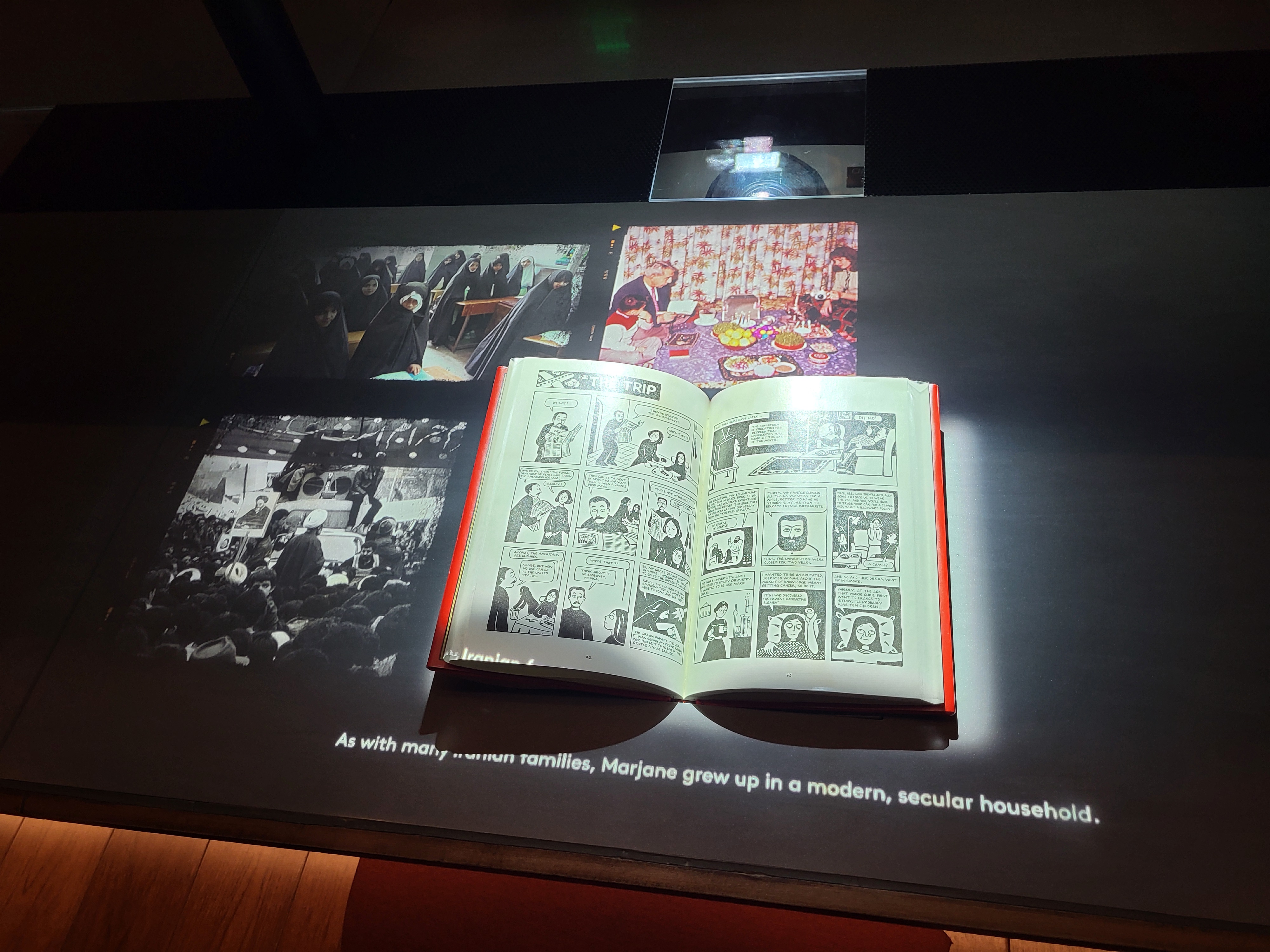 Next up was the “library.” It was dark and beautiful and had mirrors on the ceilings to make the bookcases along the walls seem like they were super tall. The idea here seemed to be to get people excited about books and reading. Some books were decorative, but all along the walls were forward-facing books that you could take down and place on little stands on the tables. When you open the book up, a sensor detects which book you are reading, and a video projects down onto and around your book, describing what it special or important about that particular book. They had books for all different ages and interests. This room could have taken all day if you wanted to get through all the books, but we only grabbed a couple. Here’s Persepolis: