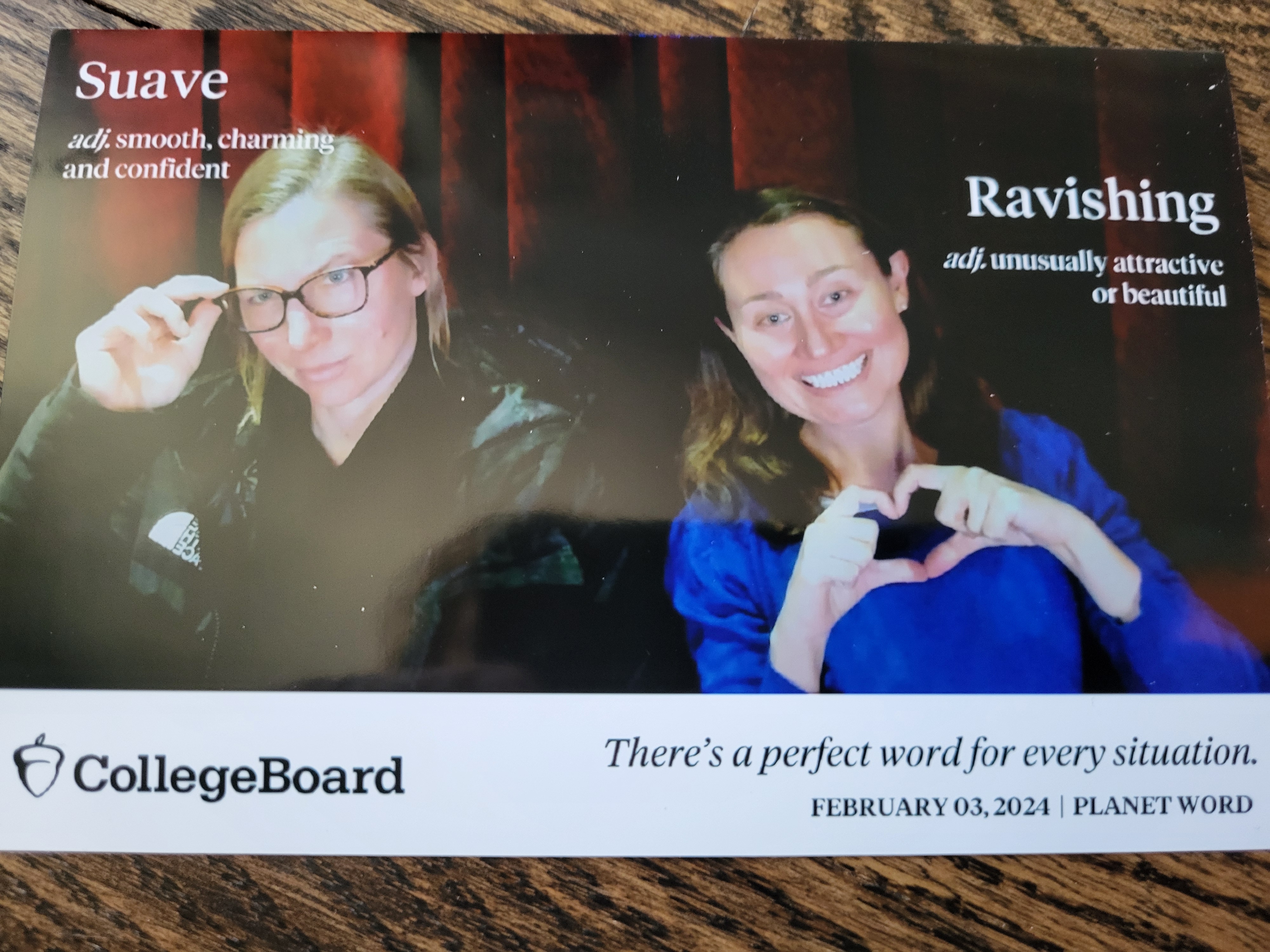 That was it for displays. We walked through an empty room with a bunch of weird holes and sign indicating there was usually a display here that was closed or under construction or something. I saw it later on a postcard, so I’m guessing it was something pretty cool that we missed. Oh well. The only thing left except for the gift shop was a photo booth where they pop words onto the screen and you’re supposed to act them out. I’m not sure what we were supposed to really learn here, either, beyond just considering how expressive, specific, and varied adjectives and be. We weren’t too excited about our prompts, but still, it was free and kinda fun, plus it’s a neat souvenir: