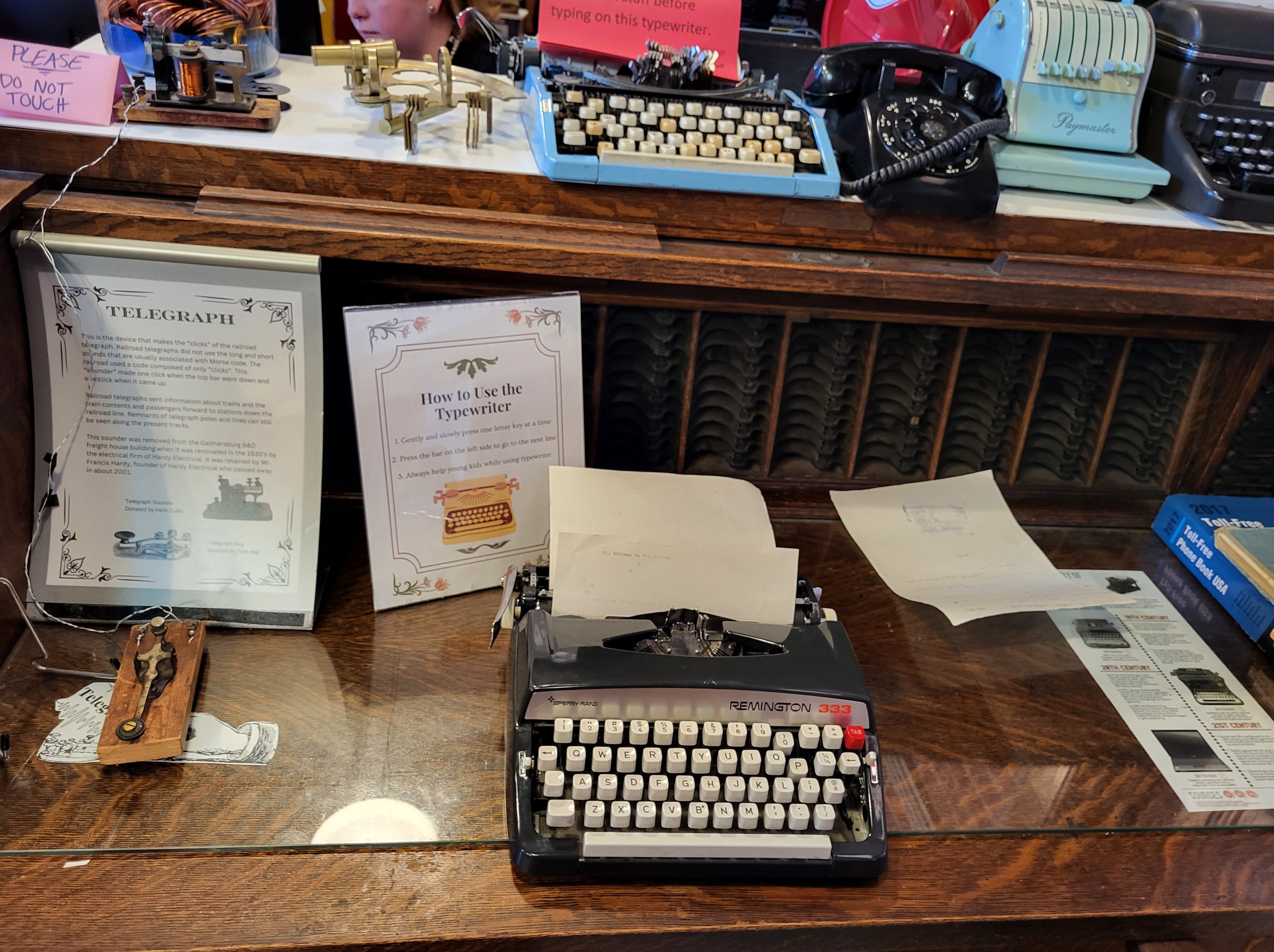 My personal favorite display was a typewriter that had a sign next to it that said, “How to Use a Typewriter.” That got an audible laugh from me, which again startled the employee whose desk was right behind the display. I told her that the idea of not knowing a typewriter because it’s so ancient was funny, and she chuckled and told me, “But the kids LOVE it!” Then she pointed to the rotary phone above it and said, “They REALLY love this thing! None of them have ever seen anything like it before!” Amazing. I, in turn, tried clicking away at the telegraph machine, which seemed to be broken. And OMG, as I look at my photo of this area posted below, I’m just now noticing the sign that says, “PLEASE DO NOT TOUCH.” Oh crap. I really hope the sign refers to the stuff on the counter and not on the kids’-level desk below… crapcrapcrapcrapmovingon!