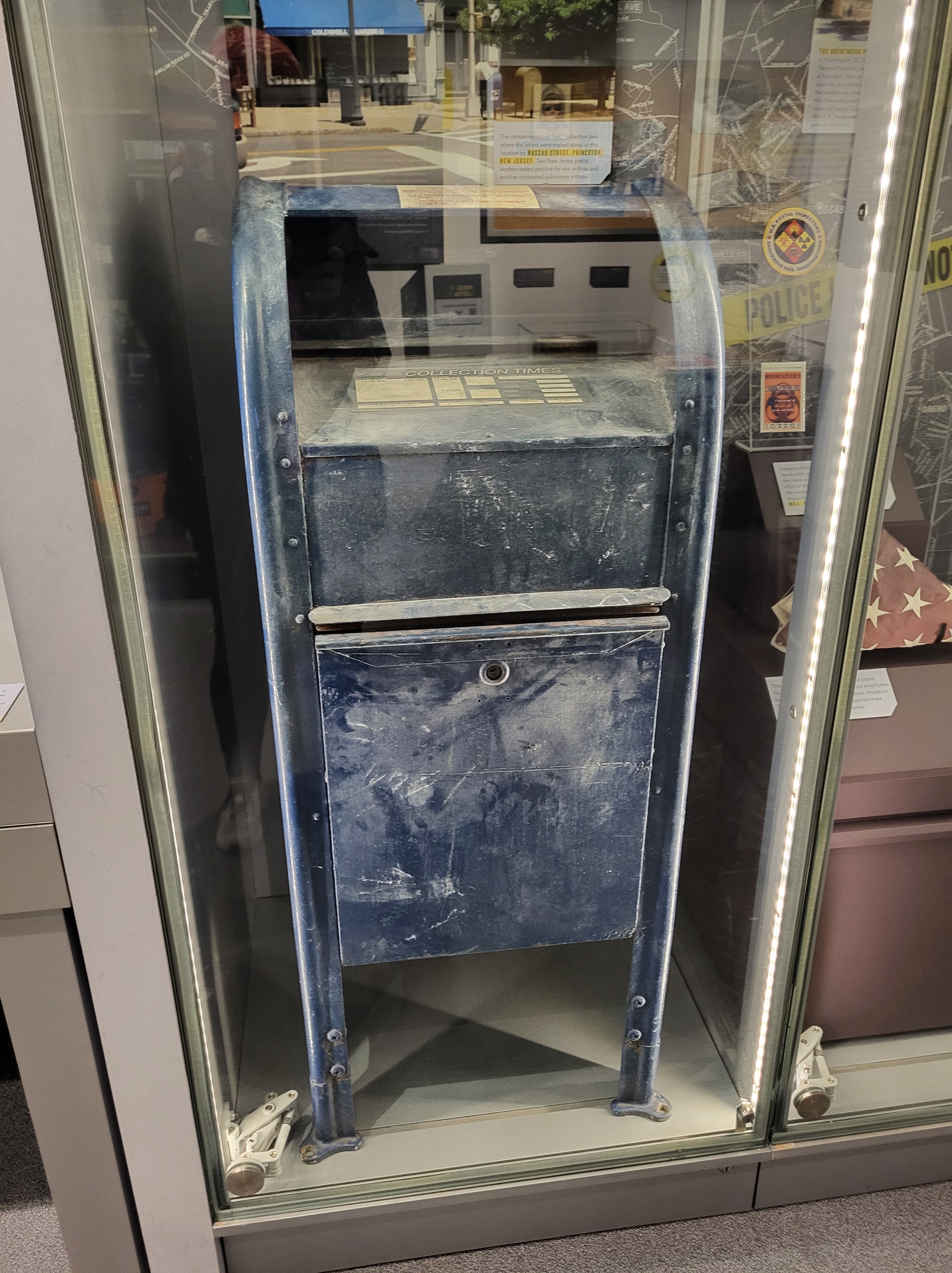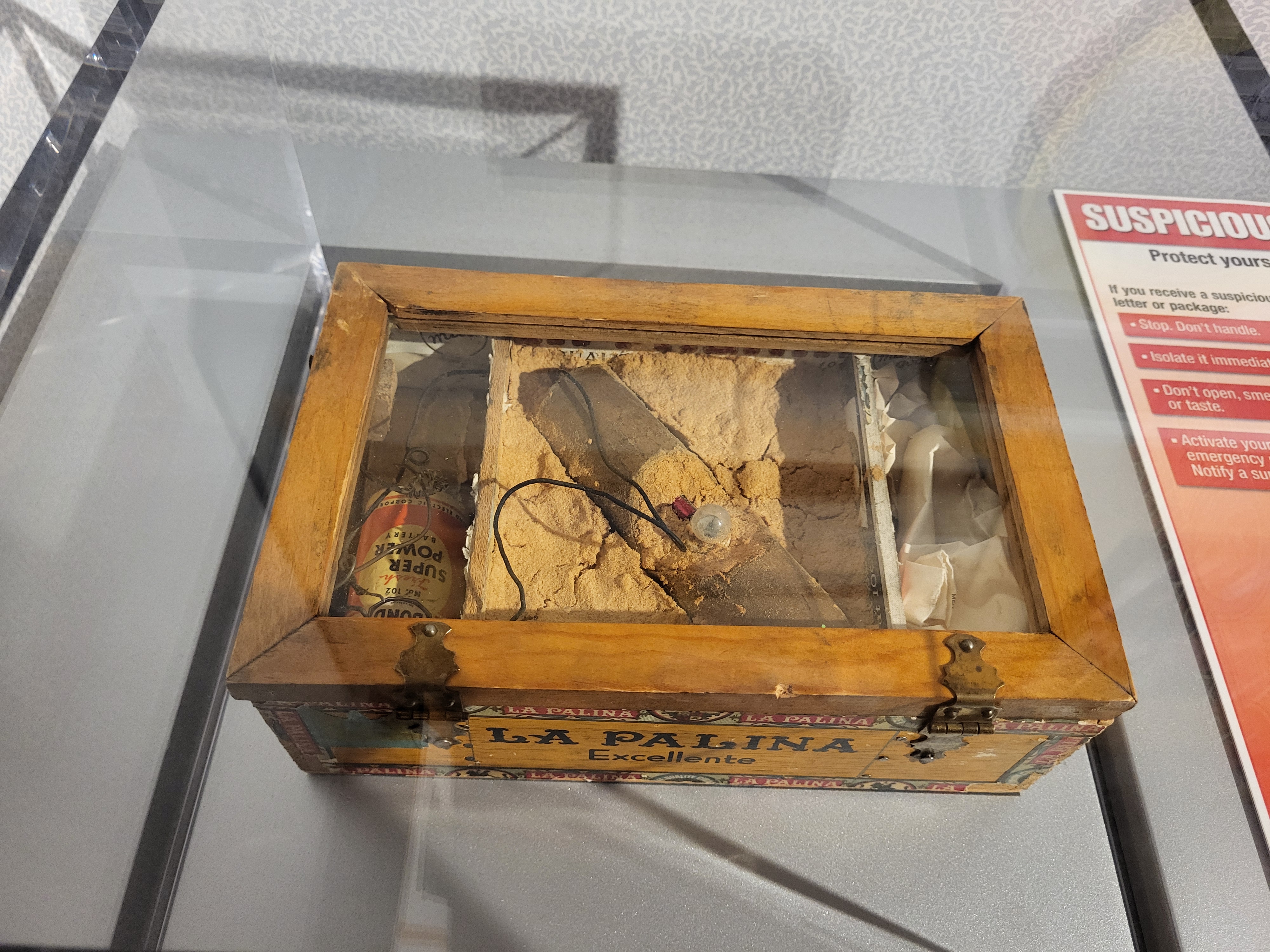 The last area I visited was “Behind the Badge,” which was all about postal inspectors. Not gonna lie, I had now expectations for this section. I’m not sure why, but I figured it couldn’t be that interesting, or that it would just feel like propaganda, maybe a bit too self-congratulatory. I’m not sure where that bias came from, but I was wrong. This section was a blast- literally! Most of the coolest artifacts in the entire museum were located here. There was a mailbox covered in anthrax, and another mailbox that had been literally shredded by a tornado (hurricane? can’t remember.) There were all sorts of illegal items they’d found in the mail, like bombs and drugs. There were all sorts of counterfeit items. I was absolutely rushing through this entire section, so it was lucky that this was the section that required the least reading and had the most visual impact. Like, yeah, I see that that’s a bomb. Neat! That being said, I definitely wish I HAD had more time here, because there was plenty of information that I barely skimmed but wished I’d been able to read at my own pace.