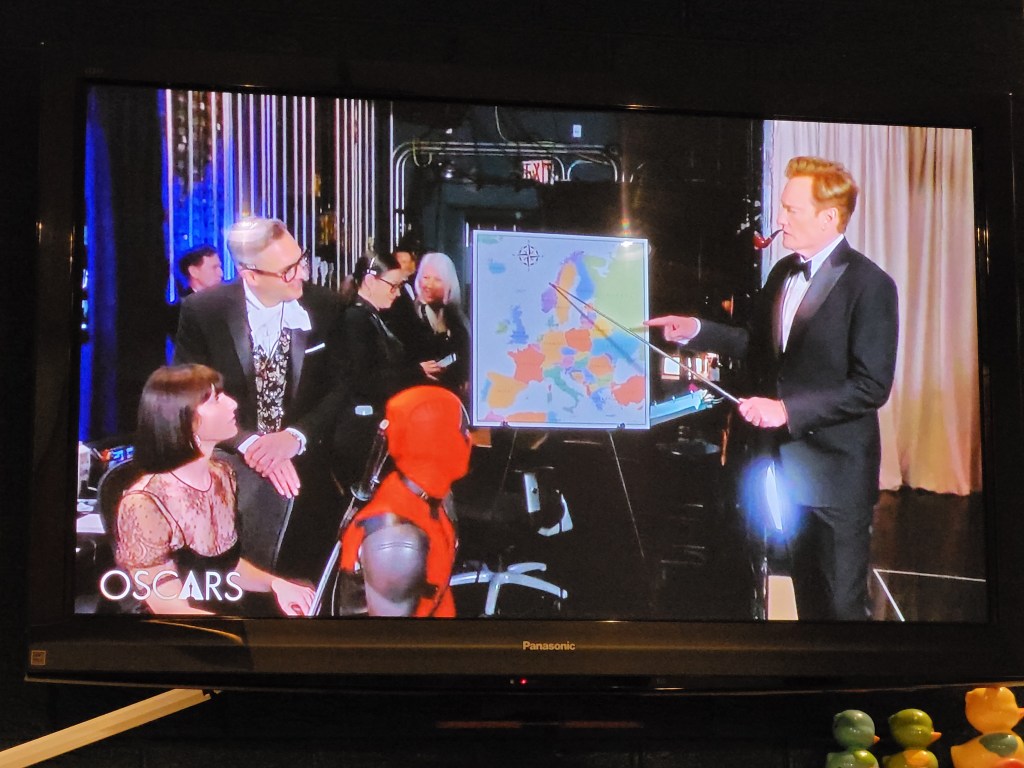 “This is Conan O’Brian’s first time hosting the Oscars.” – voiceover. I thought this was going to be followed by “Ball’s in your court, Estonia,” but instead it’s Nick Offerman (who is, I guess, the real Oscar announcer?) doing a different bit. Oh well.